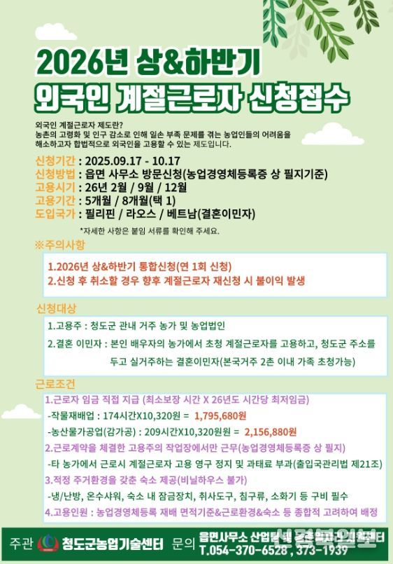 [ 신경북일보 ] 청도군은 농촌 인구감소와 고령화로 인한 농번기 일손 부족 문제 해소를 위해 9월 17일부터 10월 17일까지 '2026년 상·하반기 외국인 계절근로자' 고용 희망농가 수요조사를 실시하고 있다.