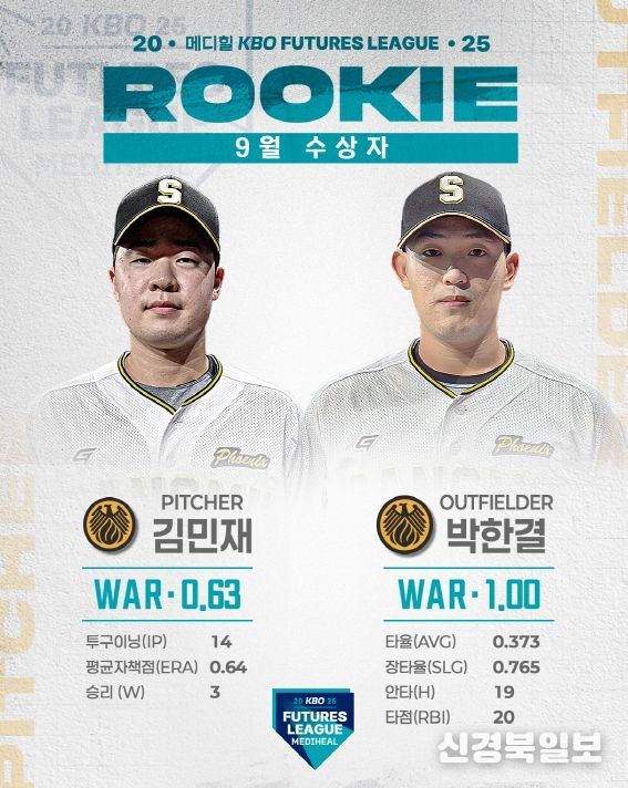 [ 신경북일보 ] 2025 메디힐 KBO 퓨처스리그의 9월 퓨처스 루키상 수상자로 투수 부문에는 상무 김민재가 WAR 0.63, 타자 부문에는 상무 박한결이 WAR 1.00을 기록하며 각각 선정됐다.