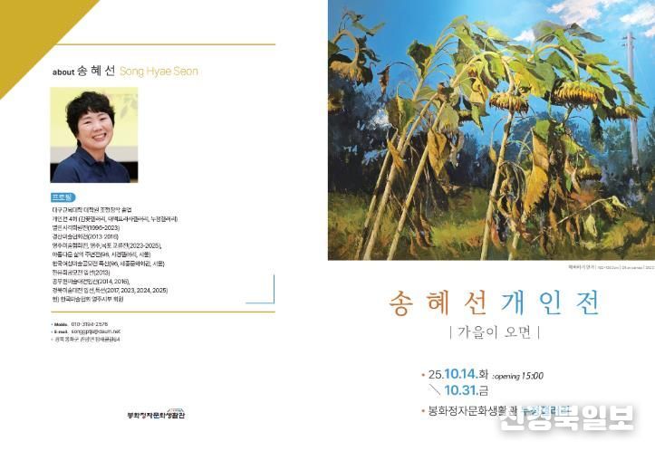 [ 신경북일보 ] 봉화정자문화생화관은 10월 14일부터 31일까지 누정갤러리에서 송혜선 작가의 개인전 '가을이 오면'을 개최한다.