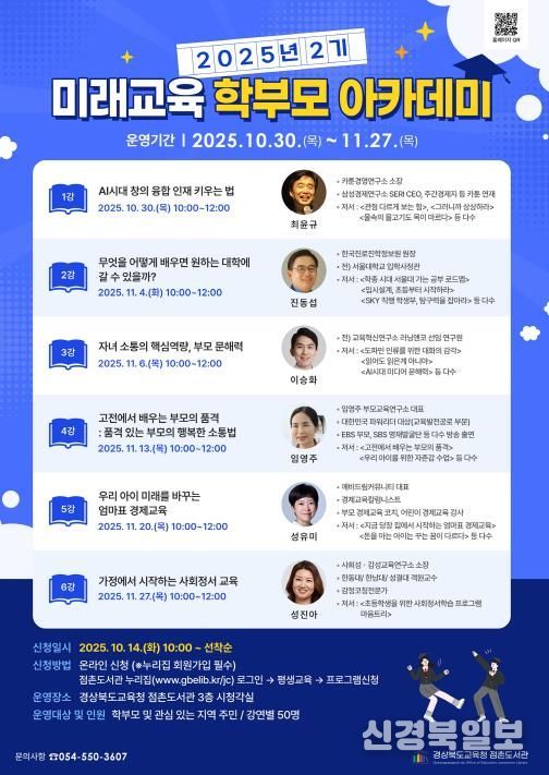 [ 신경북일보 ] 경상북도교육청 점촌도서관은 10월 30일부터 11월 27일까지 학부모 및 일반인을 대상으로 2025년 2기'미래교육 학부모 아카데미'를 운영한다.