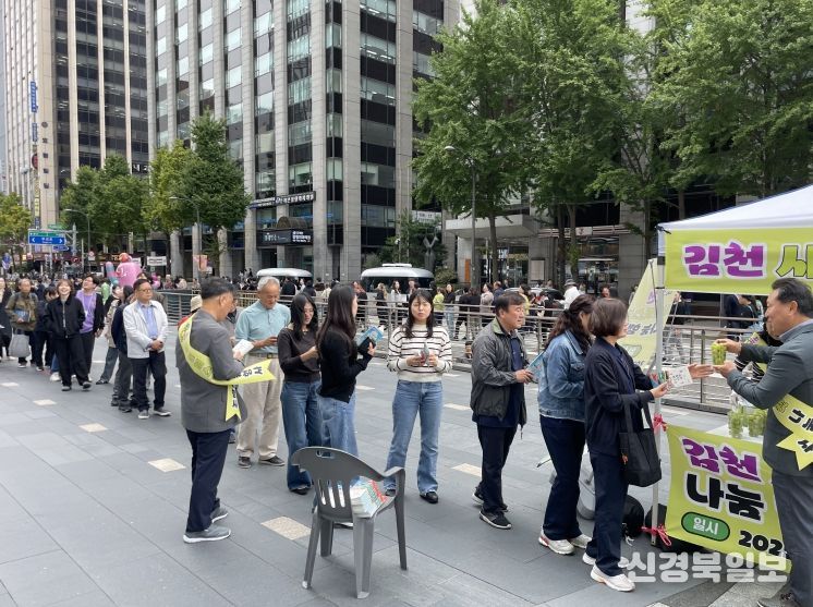 [ 신경북일보 ] 김천시 서울사무소는 10월 14일 서울 청계광장에서 김천의 대표 고품질 과일인 샤인머스켓의 우수성을 널리 알리기 위한 '김천 샤인머스켓 나눔행사'를 개최했다.