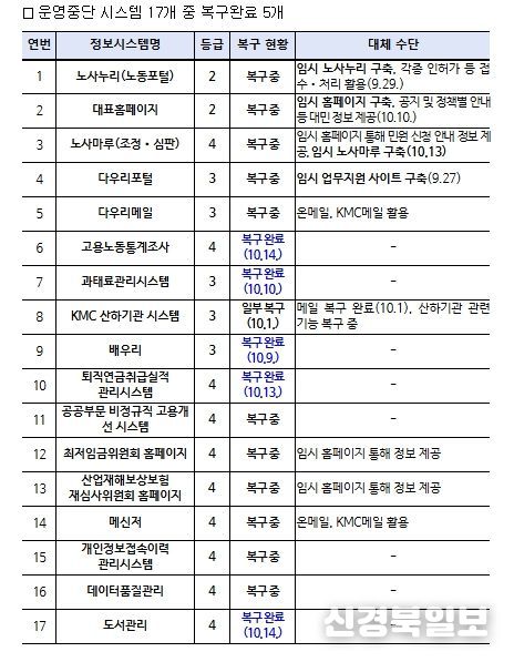 다만, 고용노동부의 노동포털 등 12개 시스템이 여전히 중단된 상황으로 임시 대표 누리집(홈페이지) 개통, 기관 대표 이메일 접수 등 대민업무에 불편을 최소화하기 위한 대체 방안을 마련·시행 중이다.