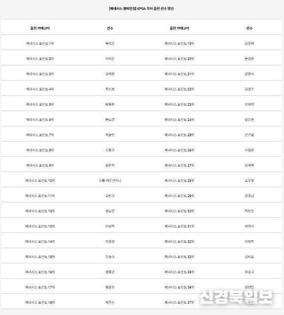 [ 신경북일보 ] 23일부터 나흘간 충남 천안 소재 우정힐스CC OUT, IN코스(파71. 7,367야드)에서 펼쳐지는 KPGA 투어와 DP월드투어 공동 주관 대회인 ‘제네시스 챔피언십’에 나서는 KPGA 투어 출전 선수 명단이 19일 ‘더채리티클래식 2025’ 종료 후 확정됐다.