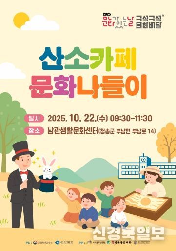 [ 신경북일보 ] (재)청송문화관광재단은 오는 10월 22일과 11월 25일 청송군 부남면 남관생활문화센터에서 2025 문화가 있는 날 '구석구석 문화배달' 사업의 일환으로 ‘산소카페 문화나들이’ 행사를 개최한다.