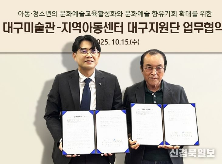 [ 신경북일보 ] 대구문화예술진흥원 대구미술관과 지역아동센터대구지원단(단장 이상열)은 지난 10월 15일 대구미술관에서 아동·청소년 문화예술교육 활성화와 문화예술 향유 기회 확대를 위한 업무협약을 체결했다.