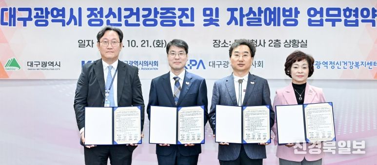 [ 신경북일보 ] 대구광역시는 10월 21일 오전 11시 동인청사 2층 상황실에서 ‘대구광역시 정신건강 증진 및 자살예방 업무협약’을 체결했다. 이번 협약은 대구 시민의 정신건강 증진과 자살 예방을 위한 지역사회 거버넌스 구축을 목표로 한다.