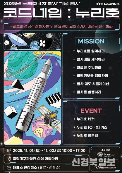 [ 신경북일보 ] 국립대구과학관은 오는 2025년 11월 27일로 예정된 누리호 4차 발사를 기념해, 우주개발에 대한 국민적 관심을 높이고 과학문화 확산을 도모하기 위한 기념 행사를 개최한다.