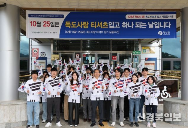 [ 신경북일보 ] 영양군은 10월 24일 오전 독도의 날을 기념해 군청사 입구에서 오도창 영양군수를 포함한 공직자 60여 명이 참석한 가운데 ‘독도 사랑 티셔츠 입기 운동’행사를 진행했다.