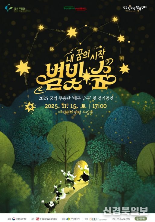 [ 신경북일보 ] 대구 남구청소년창작센터는 오는 11월 15일 17시 대덕문화전당 드림홀에서 꿈의 무용단 '대구 남구'의 첫 정기공연 ‘내 꿈의 시작, 별빛 숲’을 개최한다고 밝혔다.