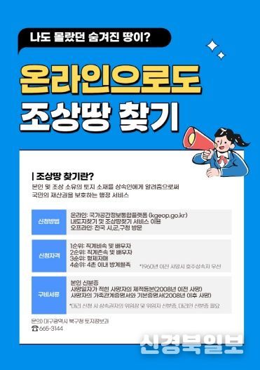 [ 신경북일보 ] 대구 북구청은 시민들의 재산권 보호와 토지 재산 관리 편의 제공을 위해 ‘조상땅 찾기’서비스를 상시 운영 중이라고 밝혔다.