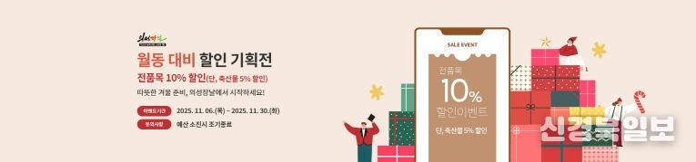 [ 신경북일보 ] 의성군이 운영하는 온라인 농특산물 쇼핑몰 ‘의성장날’에서 겨울철을 앞두고 지역 농·특산물 소비 촉진을 위한 ‘월동 대비 할인 기획전’을 진행한다. 이번 기획전은 11월 6일부터 11월 30일까지 진행되며, 행사 기간 동안 전 품목 10%, 축산물 5%의 특별 할인이 적용된다.