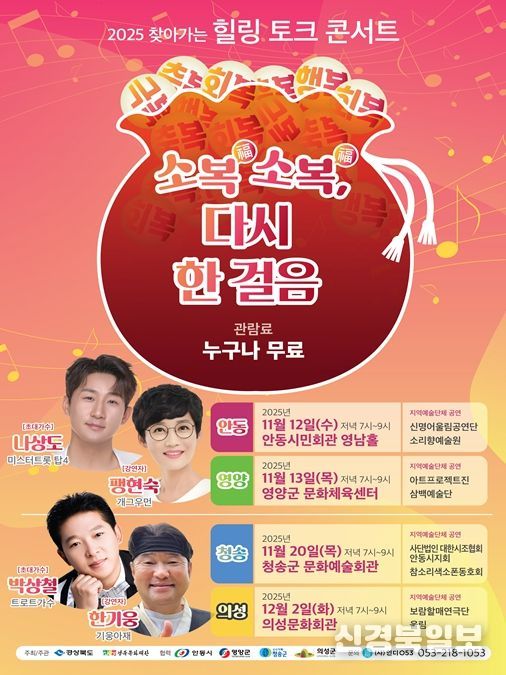 [ 신경북일보 ] 경상북도와 경북문화재단은 상반기 대형 산불로 큰 피해를 본 안동, 영양, 청송, 의성 지역민을 위로하기 위한 치유형 문화예술행사 ‘찾아가는 힐링 토크 콘서트-소복소복, 다시 한 걸음’을 개최한다.
