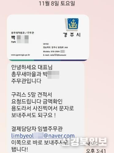 그는 한 지역 업체에 “경주시청에서 물품 구매를 진행하고 있다”며 문자메시지를 보내 견적서와 거래를 요청한 것으로 확인됐다.