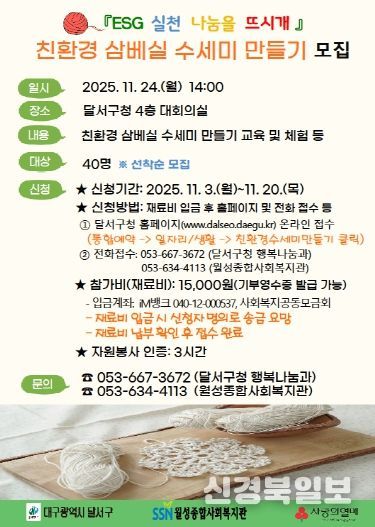 [ 신경북일보 ] 대구 달서구는 월성종합사회복지관(관장 이승희)과 함께 오는 11월 24일 오후 2시 달서구청에서 ‘친환경 삼베실 수세미 만들기’ 활동을 개최하고, 봉사와 나눔을 실천할 참여자 40명을 모집한다.