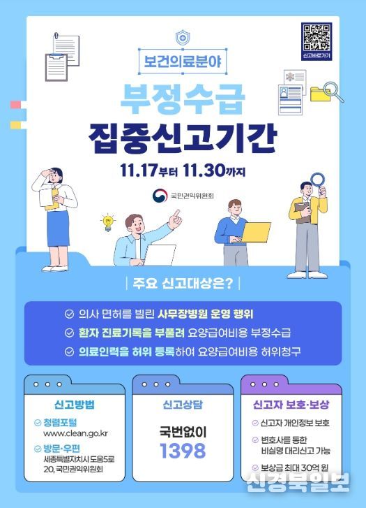 [ 신경북일보 ] 국민권익위원회는 17일부터 11월 30일까지 2주간 보건·의료분야 정부지원금 부정수령 집중신고기간을 운영한다고 밝혔다.