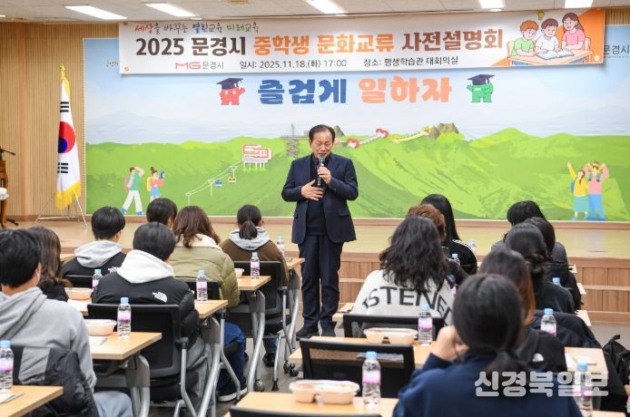 [ 신경북일보 ] 문경시는 지난 18일 문경시 중학생 문화교류 프로그램에 참가할 학생과 학부모 30여 명을 대상으로 평생학습관 3층 대회의실에서 사전설명회와 안전교육을 가졌다.