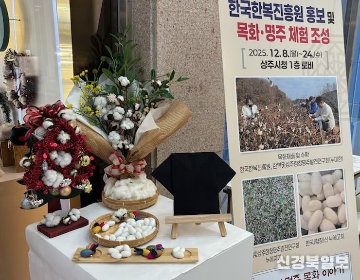 [ 신경북일보 ] 한국한복진흥원 입주기업 누미한은 12월 8일부터 12월 24일까지 진흥원 내 목화밭에서 재배한 목화솜과 명주천을 활용한 체험형 전시를 상주시청 로비에서 진행한다.