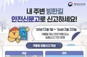 [ 신경북일보 ] 내 주변 빙판길 안전신문고로 신고하세요! '25년 12월 1일 ~ '26년 2월 28일 겨울철 재난 안전 위험 요소 집중신고 기간 운영 ■ 겨울철 집중신고 대상 (대설) 제설 미흡, 제설함 관리 불량, 시설물 파손·붕괴 위험 등 (한파) 인도 결빙, 동파 우려, 고드름 낙하, 한파 쉼터 불편 등 (화재) 비상구 물건 적치, 담배꽁초 투기, 소화시설 불량, 불법 취사·소각 등 (축제·행사) 인파 밀집 우려, 행사장 시설 파손, 안전관리 미흡 등 [뉴스출처 : 행정안전부]