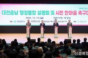 [ 신경북일보 ] 대전시는 12일 시청 대강당에서 대전광역시의회, 대전충남 행정통합 민관협의체(이하 민관협)와 공동으로 “대전충남 행정통합 설명회 및 시민 한마음 촉구대회”를 개최하고, 대전충남 행정통합 특별법안의 조속한 국회 심의․의결을 촉구했다. 이날 행사는 최근 대통령이 행정통합의 필요성을 공식 언급하면서 통합 논의가 새로운 전기를 맞은 가운데 마련됐으며, 약 600명의 시민이 참석해 추진상황을 공유하고 통합 의지를 결집했다. 이창기 민관협 공동위원장은 지난 10월 2일 특별법안 발의 이후 경과를 소개하며, 통합으로 기대되는 효과를 설명했다. 이 공동위원장은 통합 시 인구 360만 규모의 초광역 혁신 클러스터 형성, 광역교통․생활권 확장 등 실질적인 변화를 강조하며 “행정통합은 수도권 일극체제에 대응할 충청권의 경쟁력 확보 전략”이라고 밝혔다. 설명회 후에는 통합을 촉구하는 퍼포먼스가 진행됐다. 이장우 대전시장, 조원휘 대전시의회의장, 이창기 민관협 공동위원장, 남재동 대전사랑시민협의회장이 관객석에서 행정통합을 촉구하는 구호를 선창하고 시민이 후창하는 카드섹션을 펼쳤으며, 이어 무대에서는 통합