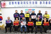 [ 신경북일보 ] 강원특별자치도의정회는 1월 27일 11시.도의회 세미나실에서 2026년도 정기총회를 개최했다. 정기총회를 진행한 가운데 의정회원들이 강원특별법 3차 개정안 심사와 통과 촉구 결의문 낭독과 함께 피켓 퍼포먼즈로 강원특별자치도의 제도적 기반 강화를 위한 의지를 한데 모았다. 이번 총회에서는 지난해 추진한 사업 성과 및 예산결산 승인과 2026년도 주요사업계획 및 세입세출예산 의결과 의정회의 지속 가능한 발전과 회원 화합을 도모하기 위한 제15대 임원진 개선이 있었다. 강원특별자치도의정회 박주선 (朴柱善/홍천/1942.06.19.생)회장이 제15대 회장으로 유임(‘26.1.2~’30.1.19/임기4년)됐다. 박주선 회장은 홍천농고(졸), 강원대행정대학원(수료), 홍천군 문화공보실장, 사회과장, 의화사무과장, 내무과장,자치행정과장,기획실장,홍천농고동창회부회장,대한역도연맹공인심판, 국제역도 연맹공인심판, 홍천군궁도회장, 자유총연맹홍천군지부장, 강원도사회 복지협의회회장, 강원특별자치도문화원연합회장, 강원도의정회사무총장, 강원특별자치도의회 제5대의원과 6대의원을 역임하시고, 현재 홍천군문화원장에 재