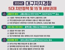 [ 신경북일보 ] 대구자치경찰위원회는 2026년을 ‘시민과 함께 만드는 일상안전의 해’로 정하고, 교통안전·인파·범죄예방·치안약자 보호·치안역량 강화 등 5대 정책 분야 및 15개 세부 과제를 추진해 나갈 계획이다. 스쿨존 가변속도제, 무인단속장비 최적화, 범죄예방 환경설계(이하 셉테드,CPTED) 확대 등을 중심축으로 시민이 체감하는 골목·생활도로·주거지 안전을 동시에 높이는 ‘입체적 일상보호 모델’을 구축한다는 구상이다. 교통안전 분야에서는 어린이 보호구역 시간제 속도제한 확대, 무인 교통단속장비 운영 최적화, 5대 반칙운전 등 테마별 단속을 추진함으로써 교통사고 사망자를 연간 10%, 최종 5년간 50%까지 감소를 달성하여 평온한 일상 속 도로 안전 확보를 목표로 하고 있다. 인파·재난 관리 분야는 2025년 인파사고 Zero 달성과 산불·집중호우 등 재난에 효과적인 대응을 향후 지속 업그레이드하기 위해 AI·드론을 활용한 첨단 관리체계 도입 및 사전 위험을 발견·차단하는 안전 활동에 시민이 안전 주체로 적극 참여하는 방안도 모색하고 있다. 범죄예방·치안약자 보호 분야는 확보된 예산을 효율적으