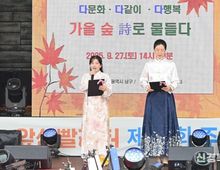 [ 신경북일보 ] 대구 남구는 깊어 가는 가을을 맞아 지난 27일 앞산빨래터공원에서 「다문화 가족과 함께하는 가을 숲속 詩낭송회」를 개최했다. 이날 시낭송회에서는 대구남구가족센터 시낭송반 다문화 수강생들이 꽃, 삶, 사랑에 관한 주옥같은 우리 시를 한국어로 낭송하며 문화와 언어의 장벽을 넘어 우리 시의 아름다움을 진심으로 표현해 청중들에게 색다른 감동과 깊은 여운을 남겼다. 또한, 시와 같이 부드럽고 아름다운 선율의 가곡 공연도 함께 진행되어 앞산을 배경으로 가을의 낭만적인 정취와 어우러져 참석자들에게 힐링과 감동의 순간을 선사했다. 조재구 남구청장은 “이번 행사는 다문화 가족과 함께하는 시 낭송을 통해 다양한 문화를 이해하고 소통하는 장을 마련하여 지역 주민들이 문학과 음악을 통해 일상 속 기쁨을 찾고 새로운 문화적 감수성을 함양할 수 있는 기회를 제공했다는 점에서 큰 의의를 지닌다”라며, “구민들이 폭넓은 인문학적 역량을 갖출 수 있도록 다채로운 인문학 프로그램을 운영하여 앞으로도 인문 공감 도시, 명품 남구를 만들어가겠다.”라고 밝혔다.