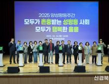 [ 신경북일보 ] 경북 울릉군여성단체협의회장(회장 박선옥)는 지난 14일 한마음회관 대공연장에서 남한권 울릉군수, 이상식 울릉군의회 의장을 비롯한 기관단체장 및 사회단체장 등 300여명이 참석한 가운데 2025년 양성평등주간 기념행사를 가졌다. 올해 울릉군여성단체협의회가 주최·주관하고 울릉군이 후원하는 양성평등주간 기념식은 “모두가 존중받는 성평등 사회 모두가 행복한 울릉”이라는 주제로 개최됐으며, 실질적인 양성평등 이념을 구현하고 그 의미를 널리 알리기 위해 매년 진행되고 있다. 행사내용은 각 단체회장 소개, 양성평등 유공자 시상, 개회식에 이어 모두가 행복한 양성평등문화 확산을 위해 결의문 낭독과 주제 퍼포먼스를 진행했으며, 양성평등 주제 강연에는 김재롱 씨가 출연하여 성평등 이야기를 쉽고 유쾌하게 풀어 시민들과 공감대를 나눴다. 이날 양성평등 문화확산에 이바지 한 유공자 표창에는 양성평등 유공자 표창(울릉군수상 박정미, 울릉군수상 홍경민, 군의회의장상 이현자), 양성평등 부부상(아이코리아울릉군지회 회장 최윤정, 권정식 부부)이 수여됐다. 박선옥 회장은 개회사에서 “양성평등은 모두가 함께 만들어