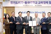 [ 신경북일보 ] 경기도의회는 23일 오전 의장 접견실에서 동국대학교와 교육협력 및 학술교류를 위한 업무협약(MOU)을 체결했다. 이날 협약식에는 김진경 의장(더민주, 시흥3)과 고준호 의원(국민의힘·파주1), 김완규 의원(국민의힘·고양12), 이병숙 의원(더민주·수원12), 박호순 의정국장이 참석했다. 동국대학교에서는 윤재웅 총장, 김용현 교무부총장, 김승용 대학원장, 유한림 BMC(바이오메디캠퍼스) 행정처장 등이 함께 자리해 협약의 의의를 더했다. 양 기관은 이번 협약을 계기로 ▲의정 발전을 위한 정보 교류 ▲전문 인재 양성을 위한 교육·연구 지원 ▲도의원 및 의회 직원 대상 대학원 장학금 지원 등 의정 활동 역량 강화를 위한 체계적인 교육 협력에 나서기로 했다. 윤재웅 총장은 “대학의 교육·연구 역량을 공유함으로써 경기도 발전에 기여할 수 있게 되어 뜻깊다”며 “경기도의회와의 지속적인 협력을 통해 실효성 있는 교육 지원을 이어갈 수 있도록 최선을 다하겠다”라고 말했다. 김진경 의장은 “의회에 대한 도민의 기대는 점점 더 복잡해지고 다양화되고 있는 만큼 의회 구성원 모두가 더 많이