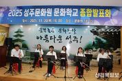 [ 신경북일보 ] 성주문화원(원장 이창길)은 지난 20일 성주문화원 3층 강당에서'2025 성주문화원 문화학교 종합발표회'를 성황리에 개최했다. 이번 발표회는 1년간 다양한 강좌에서 갈고닦은 실력을 선보이며 지역문화의 깊이를 더하는 화합의 장으로 마련됐다. 문화학교는 민요, 사물놀이, 한국무용, 해금, 다도, 아코디언 등 전통·예술·생활문화를 아우르는 15개 강좌로 구성되어 있으며, 특히 수강생의 대부분이 중·장년층과 어르신들로 구성돼 있음에도 불구하고, 배우고자 하는 열정과 참여 의지가 매우 높다는 점이 특징이다. 이들의 꾸준한 참여 덕분에 지역 문화교육 프로그램이 연중 활기를 잃지 않고 운영되고 있다. 이날 발표회에서는 ▲사물놀이 ▲민요·아리랑 ▲아코디언 ▲한국무용 ▲해금 연주 ▲다도 시연 등 다채로운 무대가 펼쳐졌으며, 서예반·서양화반·중국공필화반의 작품 전시도 열려 관객들의 큰 관심을 모았다. 이창길 성주문화원장은“문화학교는 어르신들의 배움의 열정이 가장 빛나는 공간”이라며 “함께 배우고 어울리는 모습이 성주 문화의 힘”이라고 말했다. 또한 내년에도 더욱 유익한 강좌로 군민들을 찾아가겠다고 밝혔다. &n