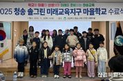 [ 신경북일보 ] 경상북도청송교육지원청은 12월 20일 청송교육지원청 대회의실에서 3개 마을학교 학생, 마을 교사, 학부모 등 약 100명이 참석한 가운데 2025년 청송 솔그린 미래교육지구 마을학교 수료식을 개최했다. 청송 솔그린 미래교육지구는 지역사회와 학교가 함께 교육력을 높여 평생교육까지 확장하여 배움이 있는 지속가능한 교육생태계를 조성하고자 경상북도청송교육지원청, 청송군청, 학교, 마을이 협력하고 연대하는 공동체로 2025년에는‘작은 학교 도담’,‘참보배 학교’,‘마실애 학교’3개의 마을학교가 청송 솔그린 미래교육지구 사업에 참여했다. 이날 수료식은 마을학교의 성과를 공유하고 지역사회의 학교 교육 참여를 확대하고, 마을과 함께 협력하는 돌봄을 활성화하기 위하여 마련됐다. 특히 올해는 미래교육지구 운영 3년 차를 맞아 3개 마을학교가 일 년 동안 활동한 모습을 영상으로 제작하여 감상하고 또한 학생들이 준비한 활동 소감을 마을학교별 대표 학생이 발표했다. 특히 진보초등학교 5학년 장○서 학생은 ‘1년간 주말과 방학 중에 열심히 지도하고 돌봐주신 마을학교 선생님들에게 감사하다.’고 말하여 참석한