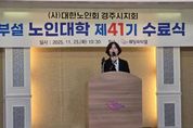 [ 신경북일보 ] 경주시는 대한노인회 경주시지회 부설 ‘경주시 노인대학 제41기 수료식’이 지난 25일 오전 11시 웨딩파티엘에서 성황리에 열렸다고 밝혔다. 경주시 노인대학은 1982년 개설 이후 지역 어르신들에게 체계적인 평생교육 기회를 꾸준히 제공해 왔다. 특히 생활 건강관리, 디지털 활용, 생활경제, 인문‧교양 등 실생활 중심의 교육 프로그램을 운영하며 건전한 여가문화 조성과 사회참여 활성화에 기여해 왔다. 이를 통해 지금까지 수많은 졸업생을 배출하며 지역을 대표하는 어르신 교육기관으로 확고히 자리매김했다. 이날 수료식에는 남미경 경주시 시민복지국장, 배진석 경상북도의회 부의장, 이경희 경주시의회 행정복지위원회 위원장, 구승회 대한노인회 경주시지회장, 윤정수 노인대학장을 비롯한 내빈과 수료생들이 참석해 배움의 결실을 함께 축하했다. 남미경 경주시 시민복지국장은 “오랜 기간 배우고 나누며 성장해 오신 어르신들께 깊은 존경과 감사의 마음을 전한다”며, “평생학습을 통해 쌓으신 지혜와 경험이 지역사회 발전에 큰 힘이 되도록 시에서도 적극 지원하겠다”고 말했다. 경주시는 앞으