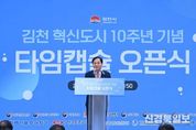 [ 신경북일보 ] 김천시가 혁신도시 준공 10주년을 맞아 율곡동 일원에서 추진한 ‘타임캡슐 개봉행사’와 ‘K-INNO 페스타’가 지난 10월 15일 시민들의 뜨거운 호응 속에 성황리에 마무리됐다. 이번 행사는 혁신도시 조성 10주년을 기념하는 동시에, 이전 공공기관 간의 소통과 화합을 통해 새로운 도약을 다짐하는 의미 있는 자리로 마련됐다. 특히 ‘타임캡슐 행사’와 ‘K-INNO 페스타’가 같은 날 함께 진행되며 그 의미를 더했다. 2016년 혁신도시 준공을 기념해 매설했던 타임캡슐을 개봉하는 행사에서는 김천시와 혁신도시로 이전한 12개 공공기관의 상징물과 기록물들을 보며, 지난 10년간의 변화와 발전을 되돌아보는 특별한 시간이 됐다. 현장을 찾은 한 기관 관계자는 “이런 물품들이 타임캡슐에 담겨 있었는지 몰랐는데, 직접 보니 감회가 새롭다.”라며, “다음 타임캡슐이 개봉될 때쯤엔 지금보다 더 발전한 혁신도시가 되기를 바란다.”라고 소감을 전했다. 타임캡슐 행사가 마무리된 뒤에는 본격적인 시민 참여 프로그램이 이어졌다. 한국전력기술 앞마당에서는 지역 농가와 소상공인들이 참여한 직거래 장터가 열려,