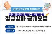 [ 신경북일보 ] 포항시평생학습원은 2026년도 정규 강좌 운영을 위해 미래사회 변화에 대응할 역량을 갖춘 전문 강사 138명을 공개 모집한다고 2일 밝혔다. 모집 분야별 인원수는 뱃머리평생교육관 일반성인 강좌 58명과 시니어 강좌 30명 및 청소년 강좌 16명, 그리고 여성문화관 정규강좌 34명이다. 자격증·직업능력·문화예술·건강·정보화·외국어·스포츠 등 기존에 수요가 높은 과목뿐 아니라, 지난 11월에 발표된 교육부의 ‘AI for All’ 정책에 맞춰 생애주기별 AI 강좌를 신규 편성해 해당 강사를 모집한다. 또한 고령층을 위한 실버 분야 자격증 강좌를 여성문화관에 새로 개설해 변화하는 학습 수요와 사회적 요구를 반영할 계획이다. 강사 모집 일정은 다음과 같다. 서류 접수는 오는 16일부터 18일까지 방문 접수로 진행되며, 응시자격은 해당 분야의 전문지식과 강의 경험 보유자, 교원자격증 소지자, 관련 자격증 소지자 등이다. 서류합격자는 12월 24일 문자로 개별 통보되고, 최종 합격자는 12월 29일 평생학습원 홈페이지를 통해 발표된다. 자세한 내용은