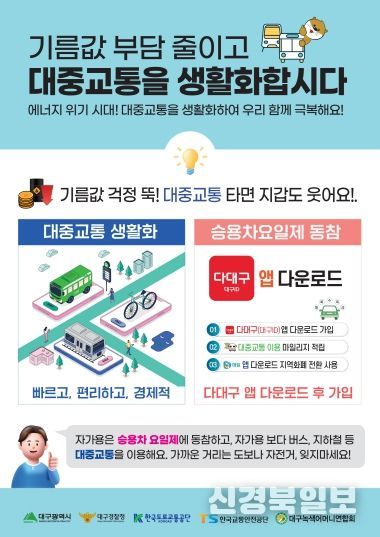 [ 신경북일보 ] 대구광역시는 중동 지역의 에너지 위기 상황에 대응해 시민들이 대중교통을 더 많이 이용하도록 장려하는 캠페인을 추진한다.