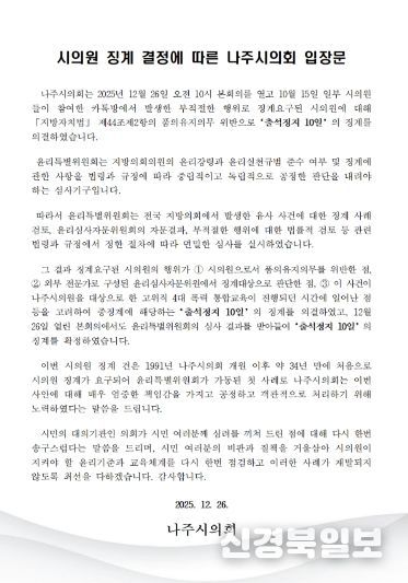 [ 신경북일보 ] 나주시의회는 2025년 12월 26일 오전 10시 본회의를 열고, 10월 15일 일부 시의원들이 참여한 카톡방에서 발생한 부적절한 행위로 징계요구된 시의원에 대해 '지방자치법' 제44조제2항의 품의유지의무 위반으로 ‘출석정지 10일’의 징계를 의결하고 입장문을 발표했다.