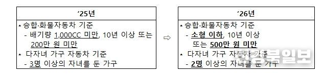 2026년부터는 소형 이하이면서 10년 이상 또는 500만 원 미만인 승합·화물차도 일반재산 환산율이 적용되고, 2명 이상의 자녀가 있으면 다자녀 가구로 인정된다.