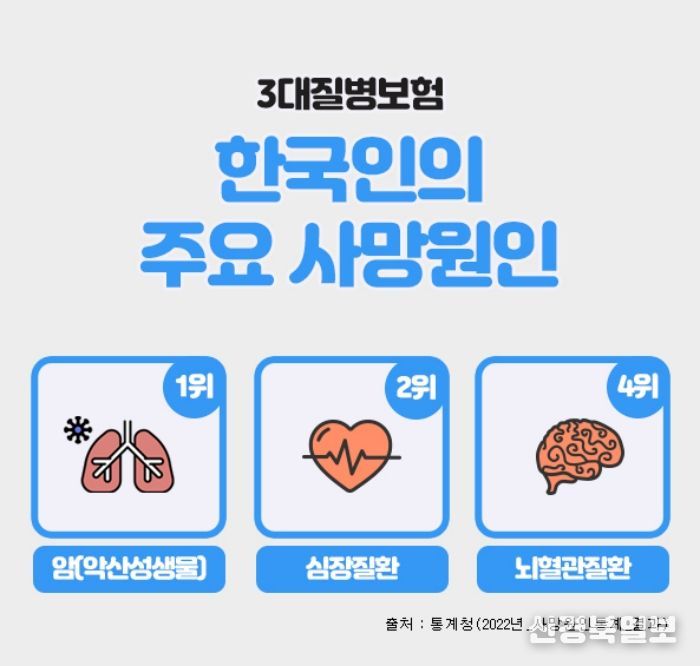 [ 신경북일보 ] 3대질병으로 일컬어지는 암, 뇌혈관질환, 심혈관질환은 한국인의 주요 사망원인에서 상위를 차지하고 있으며, 이에 대한 진단비를 집중적으로 보장해 주는 보험상품을 3대질병진단비 보험이라 할 수 있다.