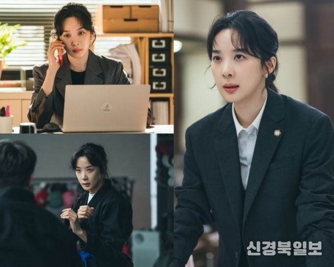 노트북 앞에 앉아 진지한 표정으로 전화를 받고 있는 장면에선 수사 중 포착된 미세한 단서도 놓치지 않겠다는 예리한 집중력과 프로페셔널한 면모가 전해진다. 날카로운 시선과 다부진 자세로 유도를 수련하는 이미지에선 유단자 변호사의 열혈 카리스마를 각인시킨다.