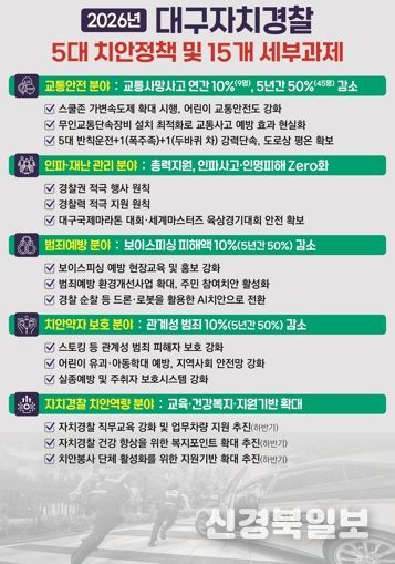 [ 신경북일보 ] 대구자치경찰위원회는 2026년을 ‘시민과 함께 만드는 일상안전의 해’로 정하고, 교통안전·인파·범죄예방·치안약자 보호·치안역량 강화 등 5대 정책 분야 및 15개 세부 과제를 추진해 나갈 계획이다.
