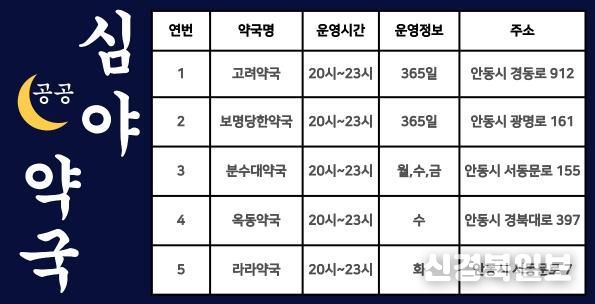 [ 신경북일보 ] 안동시는 시민의 의약품 접근성을 높이고 심야 시간대 의료 공백을 해소하기 위해 1월 1일부터 공공심야약국을 기존 2개소에서 5개소로 확대 지정해 운영 중이다.