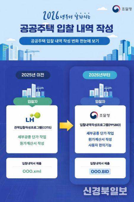 [ 신경북일보 ] 조달청은 2026년부터 LH 공공주택 입찰 시 내역서를 ‘조달청 입찰내역작성프로그램’을 이용하여 작성해야 한다고 밝혔다.