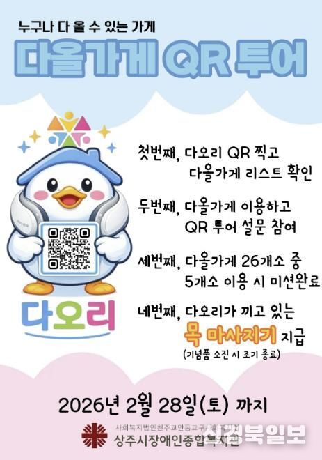 [ 신경북일보 ] 상주시장애인종합복지관은 1월 2일부터 2월 28일까지 지역 내 무장애 상가 이용을 활성화하기 위한‘다올가게 QR 투어’ 캠페인을 진행한다.