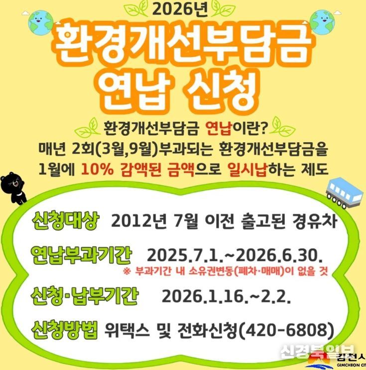 [ 신경북일보 ] 김천시는 환경개선부담금 부과 대상 경유 자동차를 소유한 자를 대상으로 2026년 1월 16일부터 2월 2일까지 환경개선부담금 일시 납부(연납) 신청을 받는다.