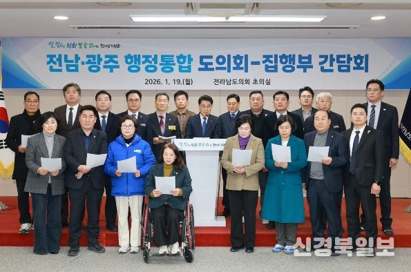 [ 신경북일보 ] 전라남도의회는 19일 도의회에서 김영록 전라남도지사와 김대중 전라남도교육감이 참여한 가운데 ‘전남·광주 행정통합 도의회–집행부 간담회’를 열고, 통합 추진 방향과 주요 쟁점에 대해 심도 있는 논의를 진행했다.