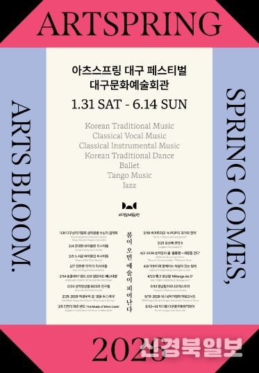 [ 신경북일보 ] 대구문화예술회관은 대구를 기반으로 활동하는 지역 예술인들의 공연을 한데 모아 그들의 예술혼을 집중 조명하는 축제 '2026 아츠스프링 대구 페스티벌'의 16개 공연을 오는 1월 31일부터 6월 14일까지 대구문화예술회관에서 개최한다고 밝혔다.