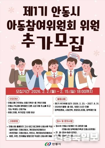 [ 신경북일보 ] 안동시는 아동의 권리를 보장하고 아동친화적인 정책 수립을 위해 운영 중인 제1기 안동시 아동참여위원회의 위원을 2월 2일부터 추가로 모집한다.
