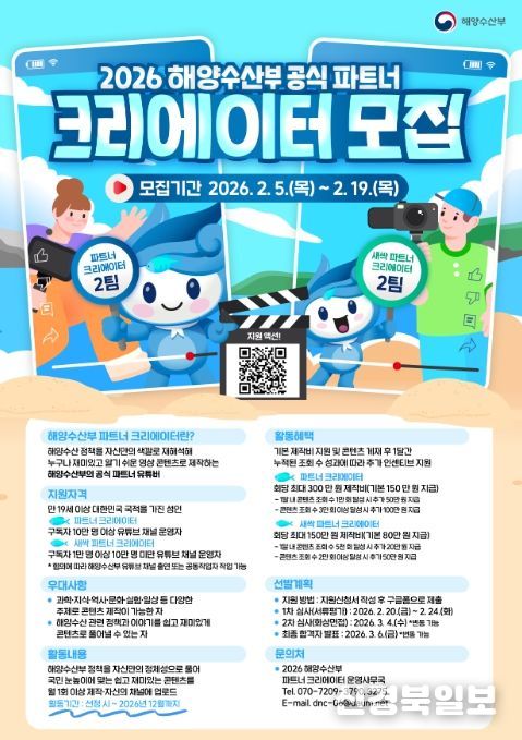 [ 신경북일보 ] 해양수산부는 2026년 한 해 동안 해양수산 정책을 국민 눈높이에 맞춰 쉽고 재미있게 전달해 줄 ‘2026 해양수산부 공식 영상 협력 제작자’를 2월 5일부터 2월 19일까지 모집한다고 밝혔다.