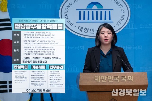 [ 신경북일보 ] 용혜인 기본소득당 의원이 4일 오전 11시40분 국회 소통관에서 기자회견을 열고 전남광주특별시 설치를 위한 특별법을 당론으로 대표발의한다고 밝혔다. 용 의원은 ”책임지는 야당답게 5극 3특 국가균형성장의 국정과제를 뒷받침하고, 산업혁신·기본사회·민주분권 선도로 전남·광주 도약을 힘차게 견인하는 쇄빙선으로 나서겠다“고 강조했다.