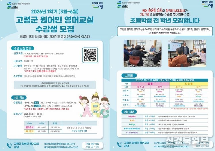 [ 신경북일보 ] 사)고령군교육발전위원회(이사장 성현덕)는 고령군 초등학생을 대상으로 영어 의사소통 능력 향상과 국제적 감각 함양을 위해 ‘2026년 고령군 원어민 영어교실’ 1학기 과정을 운영한다.