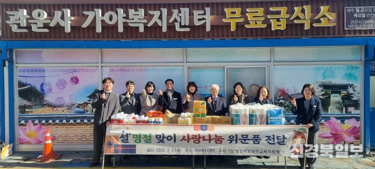 [ 신경북일보 ] 경상북도성주교육지원청은 2월 6일 설 명절을 맞아 가야복지센터(관운사 무료급식소)를 방문하여 사회복지시설 종사자들의 노고에 감사의 뜻을 전하고 위문품을 직접 전달했다.